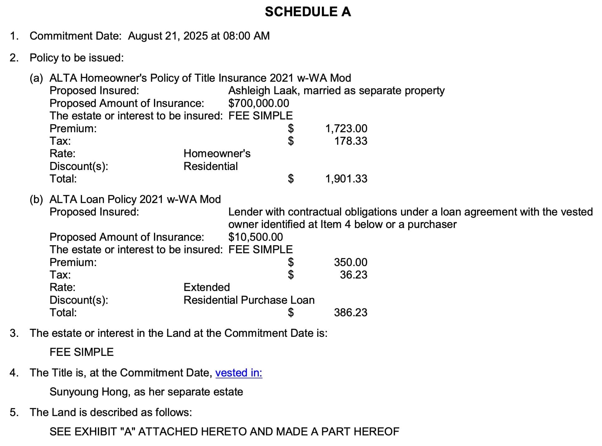 Washington Title Report Schedule A Example