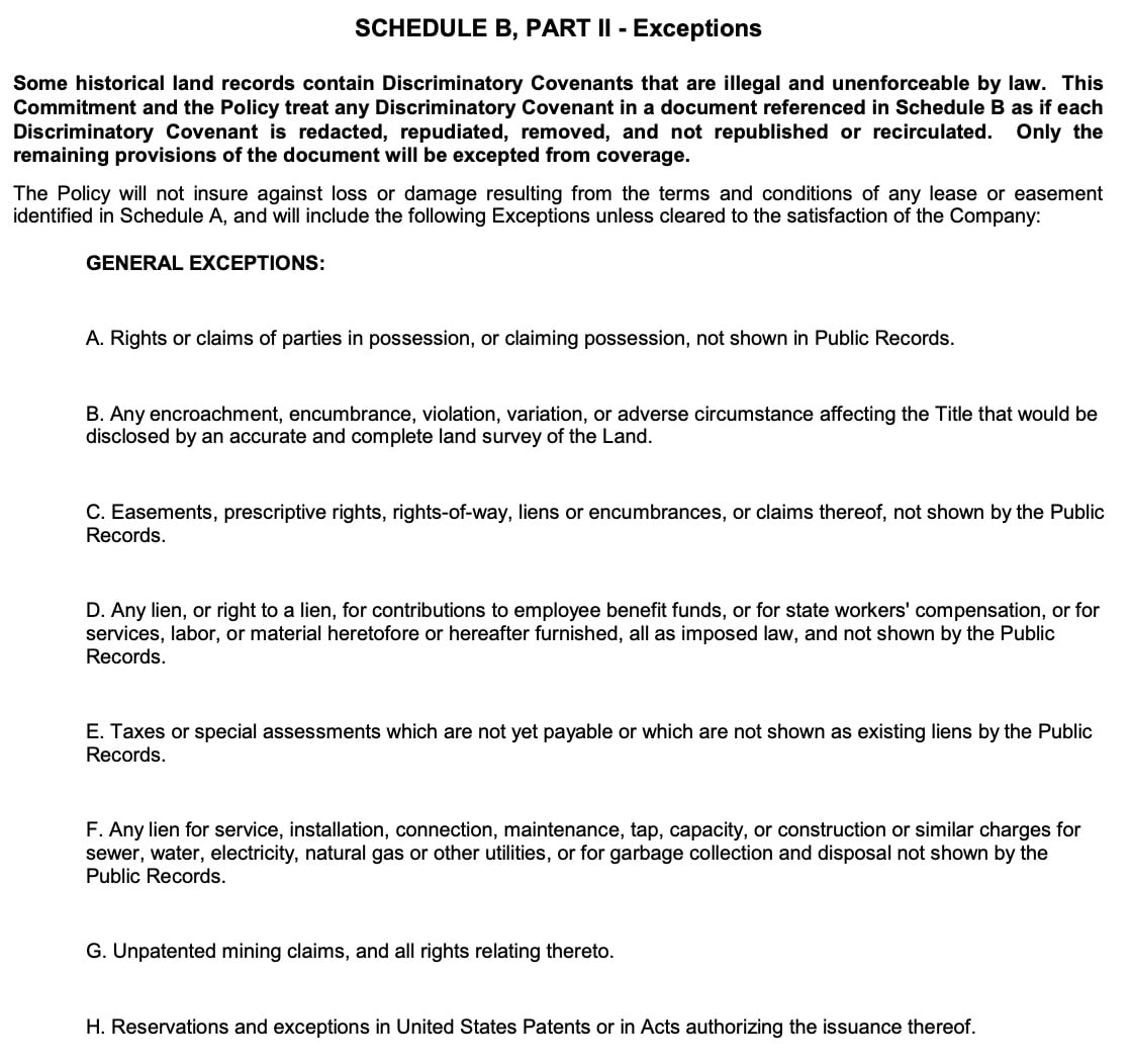 • Exceptions are recorded items—liens, easements, CC&Rs and other encumbrances—that the title insurance policy excludes from coverage. If something is listed as an exception, you’re taking title subject to it. Skim the numbered exceptions in Schedule B Part II and flag anything unusual; routine items often include property taxes and utility easements.