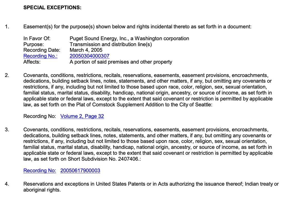 • In King County (which includes Seattle and Bellevue), exceptions might reference local improvement district (LID) assessments or recorded shoreline easements. Ask your agent if these will affect your plans.