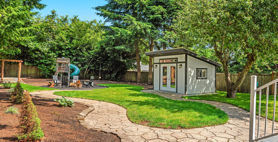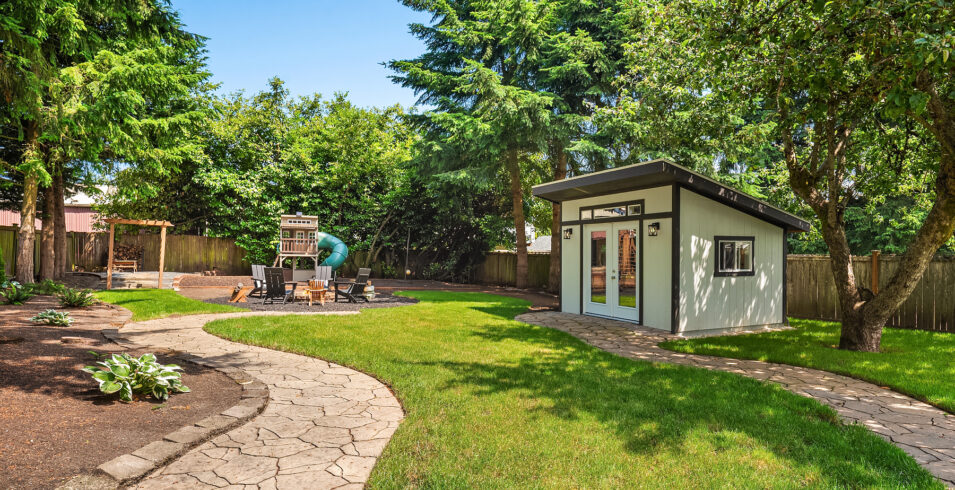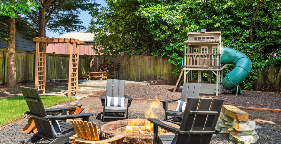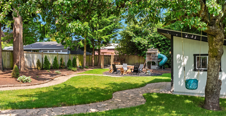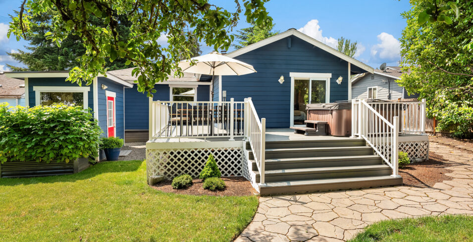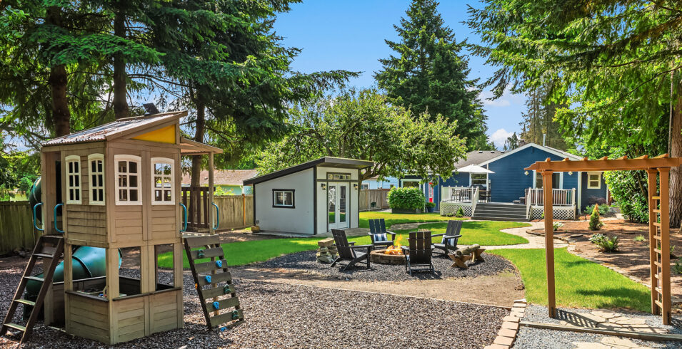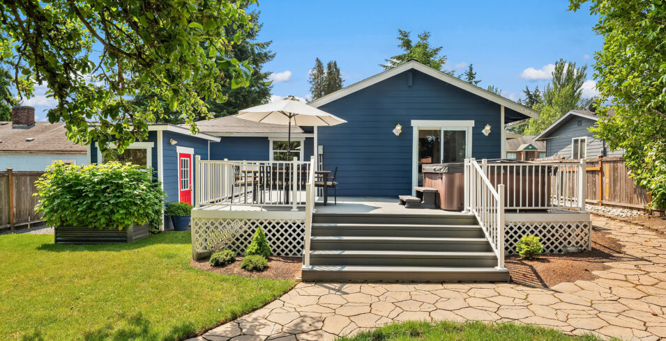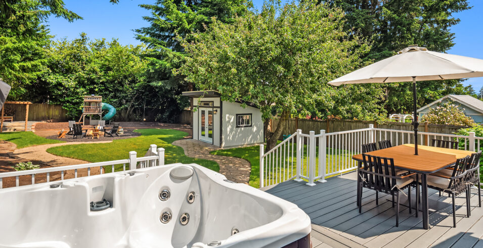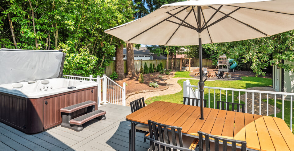 Rare 0.27 acre (11,761 sq ft) fully fenced lot with Cascade Mountain views, mature trees for privacy, play, and gardening. 400-sq-ft Trex entertainment deck plus hot tub is perfect for unwinding or your next gathering.