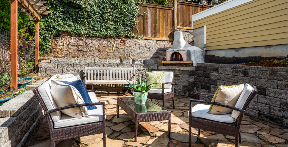 The private backyard is the kind of outdoor space that changes how you live. A garden patio with a pizza oven anchors it—not a novelty piece, an actual fire-it-up-on-a-weeknight oven. Raised garden beds line the edges, mature landscaping screens the neighbors, and there's still room for kids or a dog to run around. The upper deck off the living room catches morning light and views of the backyard canopy. In a neighborhood this walkable and this close-in, private outdoor space like this is genuinely rare.