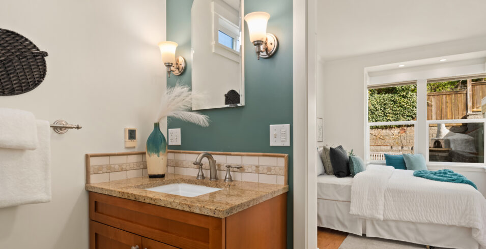 The Green-Build remodel goes well beyond cosmetics—updated plumbing, electrical, earthquake retrofit, new double-pane windows, and central A/C throughout. The main floor flows naturally from kitchen to dining to living, with hardwood floors and a skylight pulling in afternoon light. The eat-in kitchen has stainless appliances and real counter space. Upstairs, the primary suite overlooks the garden patio with a three-quarter bath featuring heated tile floors. The finished basement adds a media room with gas fireplace, home office, and serious storage—doubling your usable living space.