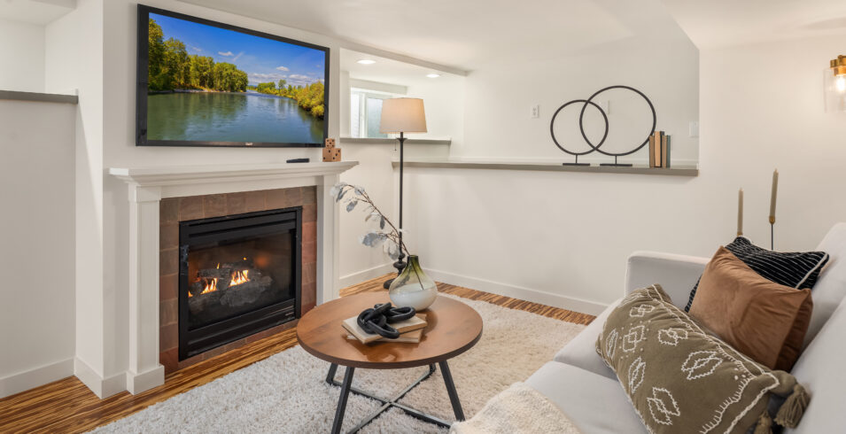 Media room with gas fireplace, home office, and storage that makes the home feel bigger than its listed square footage.