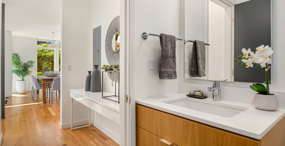 A wall of glass merges the atrium‑style living area with the landscaped courtyard. The chef's kitchen boasts a 48" commercial gas range, waterfall quartz island, walk‑in pantry, and touch‑free plumbing fixtures.